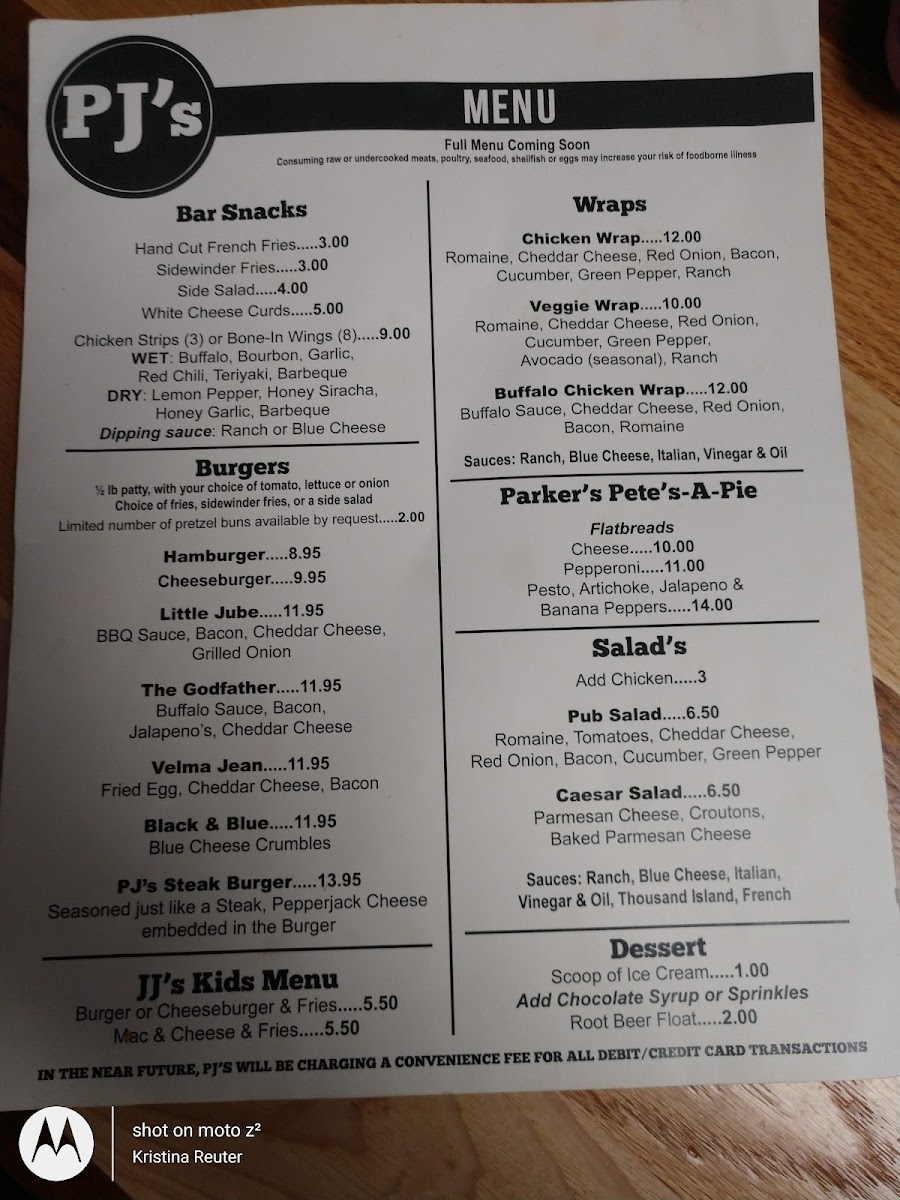 PJ's Pub & Hall Menu